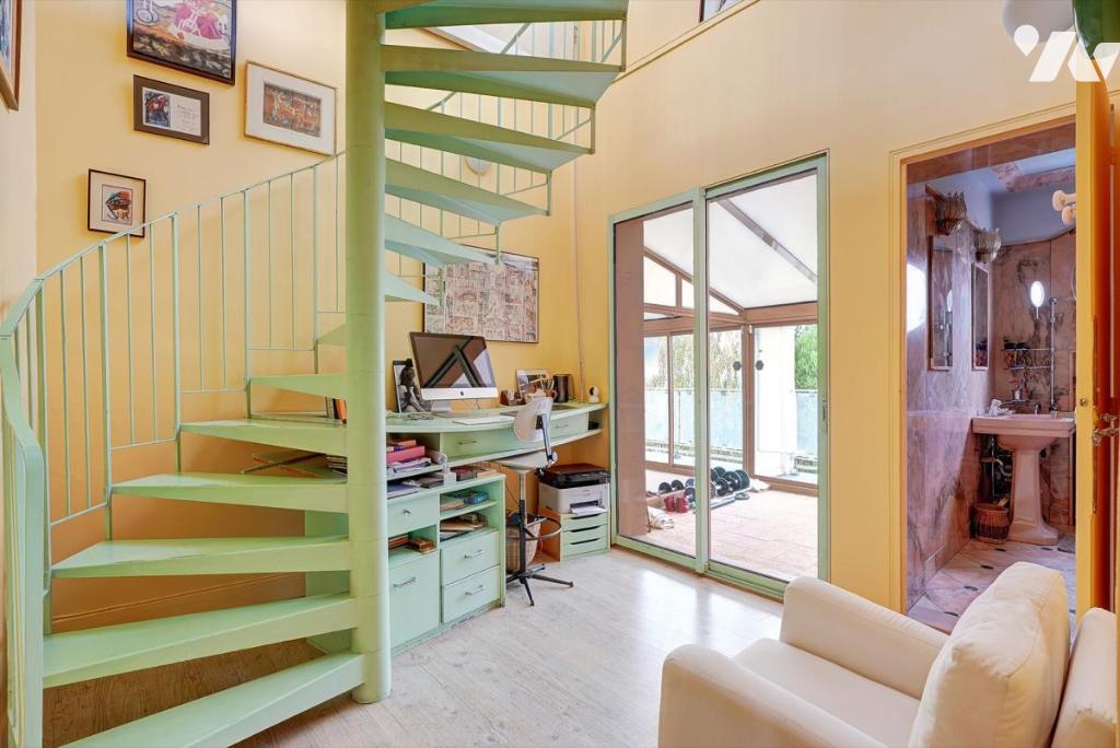 Actuellement le bien se compose d'un niveau inférieur avec une entrée, une pièce de vie avec cuisine sous véranda, d'une chambre, d'une deuxième pièce, d'un dressing, d'une salle de douche, de WC séparé, d'une cave/buanderie ; d'un niveau principal avec entrée, salon avec verrière sur jardin, salle à manger (53m² de pièce de vie) et cuisine ; à l'étage, 3 chambres, un bureau, une salle de bain, une salle de douche et un WC; enfin au niveau supérieur, une chambre et une terrasse panoramique.